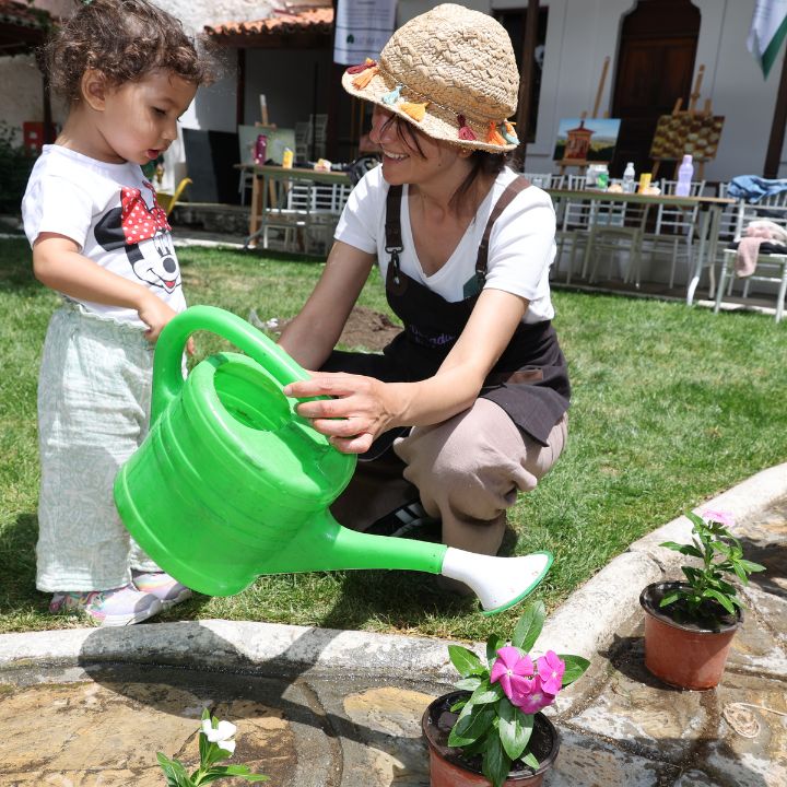 Minik Bahçıvanlar: Solucan gübresinin işlevi anlatılıyor. Her çocuk kendi saksısına toprak ve gübreyle tohum ekiyor veya fide dikiyor.