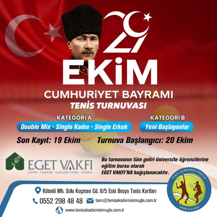 Tenis Akademisi Muğla (TAM) Spor Kulübü, 2024 yılının Ekim ayında, geliri EGET Vakfı’na bağışlanmak üzere “29 Ekim Cumhuriyet Bayramı Tenis Turnuvası” adıyla bir turnuva düzenledi.
