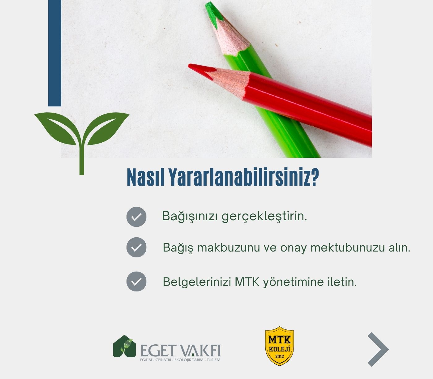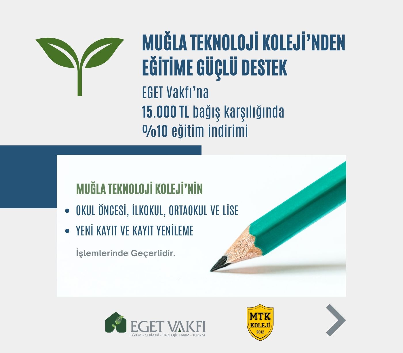 Muğla Teknoloji Koleji’nin sunduğu %10 eğitim indirimi hakkından yararlanabilmek için EGET Vakfı’na tek seferde en az 15.000 TL tutarında bir bağış yapılması gerekmektedir.